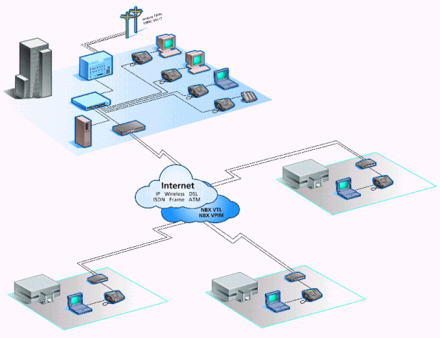 注:企業(yè)架設NBX通訊系統(tǒng)后,實現(xiàn)SOHO辦公只需要接入Internet架設VPN網絡,員工可通過小區(qū)寬帶接入或ADSL接入即可實現(xiàn)內部通訊就像在企業(yè)內部辦公一樣通訊不受任何限制?蛻魜黼姇r只需撥打分機號,無論員工在任何地點都可接聽來電。企業(yè)可以通過TCA(通訊助理)軟件給員工發(fā)送公告、組建電話會議、短信通知等應用。