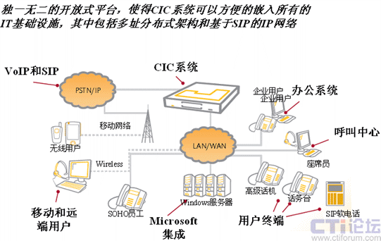 對(duì)于企業(yè)而言,CIC是一套基于IP的完整的通信解決方案,與傳統(tǒng)PBX電話系統(tǒng)不同的是,CIC通過一個(gè)單一的軟件平臺(tái),可以將語(yǔ)音,數(shù)據(jù)和企業(yè)員工有機(jī)的聯(lián)系起來(lái),而傳統(tǒng)的PBX電話系統(tǒng)只能提供語(yǔ)音服務(wù),無(wú)法和現(xiàn)今流行的IP信息系統(tǒng)相結(jié)合。