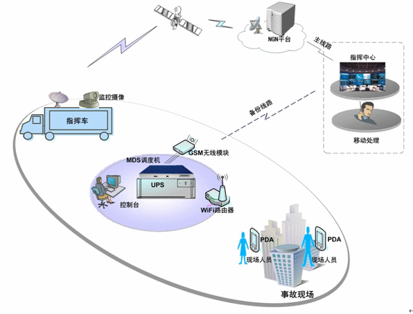 MDS調(diào)度機(jī)通過衛(wèi)星道與政府的NGN平臺對接,實(shí)現(xiàn)與整個城市的通信系統(tǒng)對接;并通過GSM、CDMA備份線路,實(shí)現(xiàn)多通信通道的實(shí)時切換,選擇最好的路由進(jìn)行通信。MDS調(diào)度機(jī)負(fù)責(zé)語音通訊、調(diào)度作業(yè)和指令消息轉(zhuǎn)發(fā);應(yīng)急指揮車配備調(diào)度機(jī)、調(diào)度臺、移動調(diào)度終端、衛(wèi)星接收設(shè)備、監(jiān)控視頻設(shè)備及其他設(shè)備。所有的調(diào)度語音終端都可與MDS調(diào)度系統(tǒng)對接,實(shí)現(xiàn)調(diào)度功能及與其他的通信終端進(jìn)行通信。