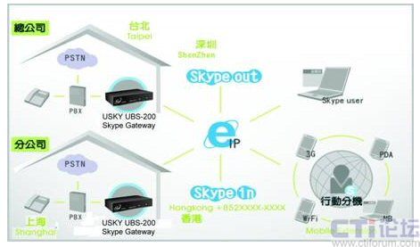 本公司新推出USKY UBS-400(4 ports)/UBS-200(2 ports) Skype Gateway,是專為企業(yè)用戶所設(shè)計的外接式Skype網(wǎng)關(guān)。只須將原有電話交換機(jī)(PBX)連接上我們的USKY UBS-400/UBS-200,企業(yè)用戶無需改變撥號方式,便可輕松透過桌上電話撥打或接聽Skype電話,將傳統(tǒng)電話提升為網(wǎng)絡(luò)電話(VoIP),既簡單又方便!有效幫助企業(yè)用戶增加通話效率,更能大幅減少通話費。