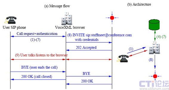 在過去幾年,開發(fā)人員已經日益使用CCXML給他們的電話系統增加強健的呼叫控制特性。圖3展示了如何在VoiceXML與SIP環(huán)境中運用CCXML平臺進行高級會議控制[4]。在這里CCXML作為SIP的“背靠背用戶代理”,面向呼叫者和網絡資源(比如VoiceXML瀏覽器和會議混合器)執(zhí)行基于SIP的呼叫控制職能,可以基于開放式的行業(yè)標準方式創(chuàng)建健壯可靠的多方會議系統。Voxeo