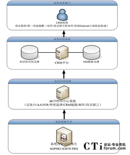 原先電話系統(tǒng)與CRM系統(tǒng)是獨立的兩個系統(tǒng),客服人員面對大量的客戶,迅速的獲悉來電客戶的身份、背景資料以及歷史資料在很大程度上決定了其服務質(zhì)量。BCT呼叫中心系統(tǒng)位于PBX與CRM之間,作為一個中間的橋梁,對PBX送來的電話信息或者用戶輸入的卡號等數(shù)據(jù)進行處理分析,對主叫號碼或用戶輸入卡號進行識別后,傳遞給CRM;CRM檢索與其相連的HIS(醫(yī)院信息系統(tǒng))的數(shù)據(jù)庫,將客戶資料以及相關的歷史記錄通過彈出網(wǎng)頁的模式,同步的顯示在坐席的計算機上,方便客服代表的輸入和后續(xù)操作,提高了效率與正確率。同時,客戶代表還可以在CRM頁面中點擊電話號碼,通過BCT發(fā)起電話呼叫來聯(lián)系客戶,來處理用戶回訪等工作。