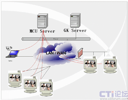 當(dāng)召開多點(diǎn)的交互式會議時則需要MCU(多點(diǎn)控制器)的參與。MCU的作用類似于交換機(jī),主要完成各會場圖像的切換和語音的混音功能,一般放置在主會場。在MCU的控制下可以實(shí)現(xiàn)語音激勵、導(dǎo)演控制等多種會議控制方式。