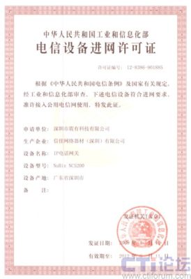CTI論壇(ctiforum)05月15日消息: 日前從深圳市震有科技有限公司傳出消息,公司自主研發(fā)的NuBiz NC5200 IP電話網(wǎng)關(guān)設(shè)備順利通過(guò)工業(yè)和信息化部電信設(shè)備認(rèn)證中心的審核,取得“電信設(shè)備進(jìn)網(wǎng)許可證”。此舉標(biāo)志著震有科技的NuBiz交換產(chǎn)品已成功取得進(jìn)入國(guó)家電信網(wǎng)的資質(zhì),為大規(guī)模電信級(jí)推廣應(yīng)用打下了基礎(chǔ)。