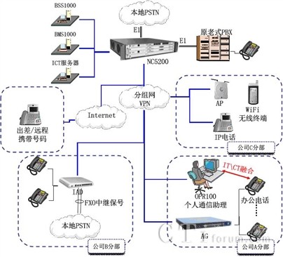 整個(gè)系統(tǒng)內(nèi)部通過主流標(biāo)準(zhǔn)協(xié)議聯(lián)結(jié),支持與運(yùn)營商IMS網(wǎng)絡(luò)的無縫對接。新增分支機(jī)構(gòu)只需增加NC5200系列IP-PBX或者IAD即可融入公司整個(gè)通信系統(tǒng)。