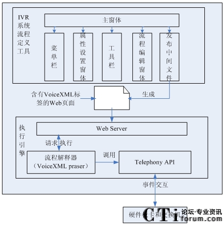 而IVR系統(tǒng)執(zhí)行引擎是根據(jù)IVR系統(tǒng)的特點(diǎn),基于VoiceXML技術(shù)的設(shè)計(jì)所實(shí)現(xiàn)的流程解釋器,主要針對(duì)解釋執(zhí)行通過(guò)IVR系統(tǒng)流程定義工具所設(shè)計(jì)的中間文件,并控制硬件交換機(jī)及板卡按照工作流程的內(nèi)容完成相應(yīng)的功能。