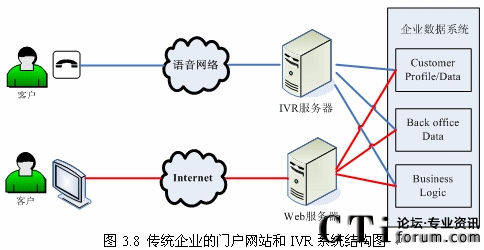 隨著Internet和Web技術(shù)的迅速發(fā)展,越來(lái)的企業(yè)開始建立自己的門戶網(wǎng)站,同時(shí)又擁有自己的IVR系統(tǒng)(如圖3.8所示),但是兩套系統(tǒng)完全獨(dú)立,語(yǔ)音系統(tǒng)和數(shù)據(jù)系統(tǒng)沒(méi)有任何交互或者只有很少的交互。而建立IVR系統(tǒng)的目標(biāo)就是給客戶更好的體驗(yàn),使客戶能方便的通過(guò)電話完成更多以前需要登陸企業(yè)門戶網(wǎng)站,或者親自去企業(yè)或其網(wǎng)點(diǎn)去辦理的業(yè)務(wù),這就需要IVR系統(tǒng)能跟后臺(tái)數(shù)據(jù)系統(tǒng)有更多更好的交互!罢Z(yǔ)音門戶”的概念出現(xiàn)也愈發(fā)的證明這一點(diǎn)。