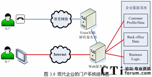 從另外一個(gè)方面,到目前為止,人們從Internet獲取各種資源時(shí),還只能是借助計(jì)算機(jī)來(lái)實(shí)現(xiàn)[24]。而實(shí)際上,電話具有比計(jì)算機(jī)更高的普及率,如果允許人們通過(guò)電話來(lái)訪問(wèn)Internet的資源,那么這對(duì)于Internet的應(yīng)用發(fā)展必將是一次質(zhì)的飛躍。在這類應(yīng)用前景的驅(qū)動(dòng)下,VoiceXML使得用戶可以通過(guò)電話按鍵或語(yǔ)音來(lái)訪問(wèn)Internet上的各種資源,它是語(yǔ)音瀏覽技術(shù)以及語(yǔ)音互聯(lián)網(wǎng)的核心。圖3.9描述了一個(gè)基于VoiceXML的現(xiàn)代企業(yè)語(yǔ)音門戶的系統(tǒng)結(jié)構(gòu)。