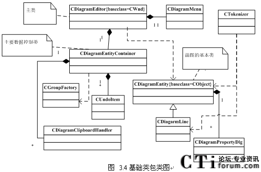 CDiagramEditor類繼承于CWnd類,它是處理窗口詳細(xì)的相關(guān)操作,所封裝的是一個(gè)基礎(chǔ)的矢量編輯器,它所生成的是圖(diagrams)而不是圖片(graphics)。所以它支持小于和大于正常窗口的虛擬屏幕(virtual screen)、網(wǎng)格抓取(snap to grid)、拷貝/復(fù)制、“無(wú)限制”(所謂無(wú)限制,只是在設(shè)置撤銷棧的大小時(shí)取值較大,讓使用者感覺(jué)上是無(wú)限制,其實(shí)是有限的)的撤銷、放大等等,由于它使用了與之“隔離”的數(shù)據(jù)容器,所以它既可以被加入對(duì)話框(dialog)和文檔/視圖(doc/view)程序里面去。通常,這個(gè)類僅僅在繪圖函數(shù)不足以滿足需要的時(shí)候來(lái)繼承使用的。