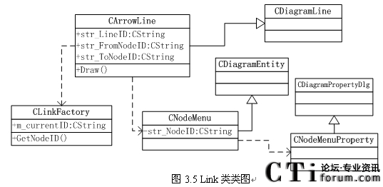 每一個(gè)節(jié)點(diǎn)保存自己的唯一的節(jié)點(diǎn)名稱,由CArrowLine類來(lái)保存其關(guān)聯(lián)關(guān)系,因?yàn)閮蓚(gè)節(jié)點(diǎn)之間的關(guān)聯(lián)關(guān)系只有二向性,所以只需要保存一個(gè) 節(jié)點(diǎn)名稱和一個(gè) 節(jié)點(diǎn)名稱。類圖如圖3.5所示,CLinkFactory類的作用是一個(gè)獲取當(dāng)前節(jié)點(diǎn)名稱,CNodeMenu類是菜單(Menu) 節(jié)點(diǎn)類,繼承CDiagramEntity類。圖中只是以CNodeMenu類未代表來(lái)表示所有的節(jié)點(diǎn)類。