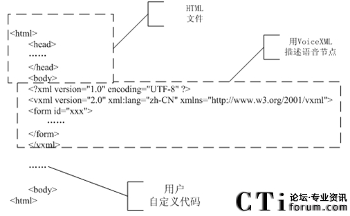 本文設(shè)計(jì)的IVR系統(tǒng)的流程文件是含有VoiceXML標(biāo)簽的Web文件,因此,首先,文件的基本框架必須符合HTML文件框架。而對(duì)語(yǔ)音節(jié)點(diǎn)的具體描述是通過(guò)某個(gè)VoiceXML標(biāo)簽或者某些具體標(biāo)簽的集合,其語(yǔ)法符合VoiceXML語(yǔ)音規(guī)范。與此同時(shí),有編程經(jīng)驗(yàn)的用戶可以添加自定義代碼來(lái)定制一些具體Web數(shù)據(jù)操作,譬如,jsp或者asp的代碼。如圖3.6所示。