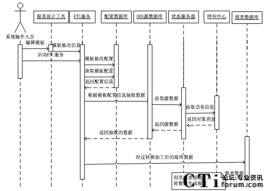在ETL服務(wù)運(yùn)行時(shí),首先它會(huì)從配置數(shù)據(jù)庫中獲取模板的配置信息,并且根據(jù)其配置信息從ODS源數(shù)據(jù)庫中抽取數(shù)據(jù)。ODS源數(shù)據(jù)庫中的數(shù)據(jù)是狀態(tài)服務(wù)器從呼叫中心中獲得的。在ETL抽取數(shù)據(jù)后對(duì)其進(jìn)行轉(zhuǎn)換和加工,將其加載到報(bào)表數(shù)據(jù)庫中。并利用報(bào)表展現(xiàn)工具將報(bào)表數(shù)據(jù)展現(xiàn)出來。其最終設(shè)計(jì)的系統(tǒng)各部件交互時(shí)序圖如圖3.5所示。