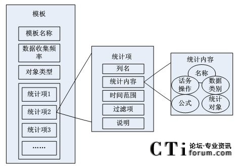 由模板結(jié)構(gòu)框架圖得知,模板包括模板名稱,數(shù)據(jù)統(tǒng)計對象,收集數(shù)據(jù)的頻率和多個基本統(tǒng)計項。其中,每個統(tǒng)計項對應(yīng)著統(tǒng)計對象(如:坐席,路由點等)的一條統(tǒng)計內(nèi)容信息(如:1小時內(nèi)的呼叫總量等)。然后由這些統(tǒng)計項和統(tǒng)計參數(shù)組合成模板,從而構(gòu)成對呼叫中心對象的統(tǒng)計信息。