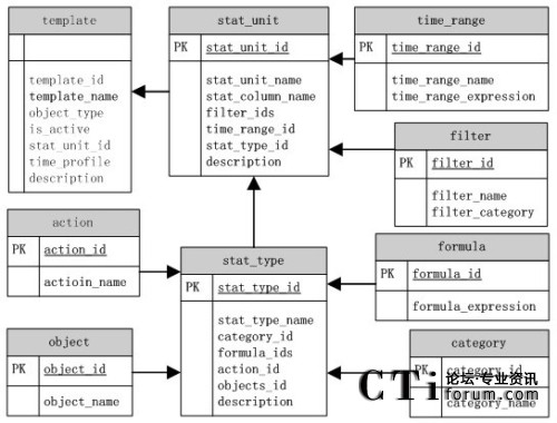 在模板配置存儲模型圖中,分別建立了單獨的表對模板劃分的每一個基本對象進行儲存。表template存儲模板的配置信息,stat_unit表存儲了統(tǒng)計項的基本信息,stat_type表是一些有關(guān)模板具體內(nèi)容的配置。各表之間通過各自的ID標(biāo)識號來進行關(guān)聯(lián)。不過一個模板可以包括多個統(tǒng)計單元,一個統(tǒng)計項可以包含多個過濾項,一個統(tǒng)計內(nèi)容可以包含多個公式,這樣他們之間的ID關(guān)聯(lián)就成為1對多的關(guān)系。在這種情況下,父項中的ID關(guān)聯(lián)多個子項ID,其間是用逗號分隔。