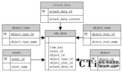 根據(jù)ODS源數(shù)據(jù)庫模型圖,ods_data表中存儲了事件發(fā)送的時間(time_key)、事件(event)、報表統(tǒng)計對象(object)、對象狀態(tài)(object_stat)、對象類型(object_type)以及一些隨路數(shù)據(jù)(attach_data)等信息。這些對象的詳細信息都是以各部分的ID來對內(nèi)容進行關(guān)聯(lián)。