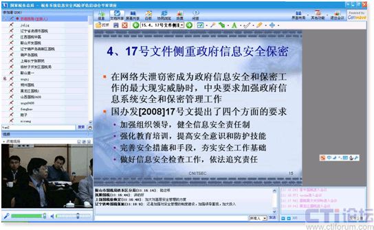CTI論壇(ctiforum)05月07日消息: 4月8日-9日國(guó)家稅務(wù)總局組織全國(guó)省國(guó)稅地稅局IT主任與解放軍總參三院、中國(guó)信息安全評(píng)測(cè)中心、神州網(wǎng)御70多人在濟(jì)南錦繡山莊以及全國(guó)各地國(guó)稅地稅相關(guān)人員200多人使用自己辦公室的電腦通過盛維(Cenwave)新世紀(jì)提供的網(wǎng)絡(luò)視頻直播系統(tǒng)召開“國(guó)家稅務(wù)系統(tǒng)信息安全風(fēng)險(xiǎn)評(píng)估啟動(dòng)會(huì)”。此次會(huì)議是國(guó)家稅務(wù)總局首次租用網(wǎng)絡(luò)視頻會(huì)議直播系統(tǒng)召開全國(guó)性會(huì)議也是參會(huì)人數(shù)最多的一次,不僅打破地點(diǎn)人數(shù)的限制、克服了硬件設(shè)備的局限、節(jié)省行政成本,也是建設(shè)“兩型社會(huì)”的具體體現(xiàn)。