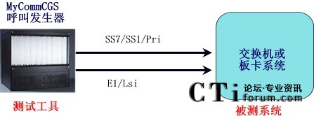 直接將MyCommCGS呼叫發(fā)生器與被測系統對接直連,連接電纜可以采用數字中繼或者模擬線路,信令支持中國7號、中國1號或者ISDN