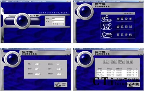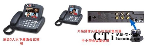 方案中采用的終端為CTS的可視電話終端,該可視電話適合于1-3人的桌面會(huì)議,自帶5寸的屏幕,不用額外連接電視機(jī),特別適合于縣級(jí)鄉(xiāng)級(jí)等底等級(jí)的機(jī)構(gòu)使用。同時(shí)可視電話可以外接入清晰的攝像頭,滿足5-10人小會(huì)場對(duì)于視頻的清晰度要求。