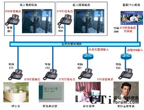 對于隔離病房的觀察,目前的實現(xiàn)可以使用遠(yuǎn)程視頻監(jiān)控,或者使用電腦方式來遠(yuǎn)程視頻交流。視頻監(jiān)控缺點無法實時與病人交流,使用電腦交流則操作比較繁瑣。CTS提出使用可視電話的方案來彌補當(dāng)前的缺點:實時與病人交流,可視電話使用操作簡單。