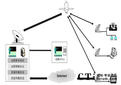 衛(wèi)星通信系統(tǒng)能實現(xiàn)組播、多點傳送和多媒體通信,支持多種媒體內(nèi)容的高速寬帶傳輸,時單向、雙向交互式的現(xiàn)代遠程教育培訓,音視頻節(jié)目的實時播出和傳送,多媒體培訓資源和數(shù)據(jù)的推送,音視頻、數(shù)據(jù)同步交互的遠程視頻會議,信息資源的傳播和發(fā)送。