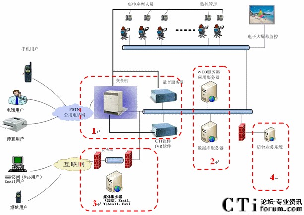 基于PBX交換機實現(xiàn)語音交換和ACD排隊、基于板卡實現(xiàn)語音資源、基于CTI中間件實現(xiàn)CallCenter功能、基于先進技術(shù)實現(xiàn)增強功能,共同搭建呼叫中心平臺。