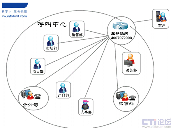 訊鳥軟件現(xiàn)有員工150人,總部位于北京,在上海設(shè)有一個分公司,在廣州、深圳分別設(shè)有一個辦事處。通過將呼叫中心與企業(yè)運營管理的融合,大大提高了員工的工作效率,降低了運營管理成本。訊鳥軟件副總裁姜冬良先生告訴我們,自2007年6月在企業(yè)運營管理中加入呼叫中心之后,所有員工對外聯(lián)系的名片上只有公司的400號碼和員工分機,不再顯示員工的手機,這樣有效的避免了因為員工流失造成的客戶服務(wù)無法及時響應(yīng)的現(xiàn)象,同時,所有員工的工作狀態(tài)可以通過報表系統(tǒng)有效的衡量,尤其是銷售人員和分公司、辦事處人員的工作,管理層可以及時的檢查、監(jiān)督和糾正。