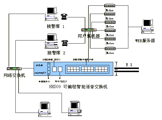 本系統(tǒng)以HXD09型可編程智能語音交換機(jī)為核心完成智能交換,內(nèi)置語音資源。