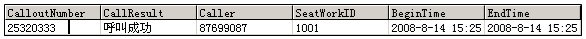 當(dāng)座席E1呼入時(shí), 接收主叫號(hào)碼(87699078), 同時(shí)發(fā)出呼叫(主叫號(hào)碼為87699078,被叫為25320333),并通過預(yù)測(cè)撥號(hào)識(shí)別各類呼叫結(jié)果,如:忙音、空號(hào)、或無人接聽等,只將有效的通話轉(zhuǎn)接至業(yè)務(wù)人員,同時(shí)將呼叫結(jié)果寫入數(shù)據(jù)庫UT_IMCALL表(如下圖),