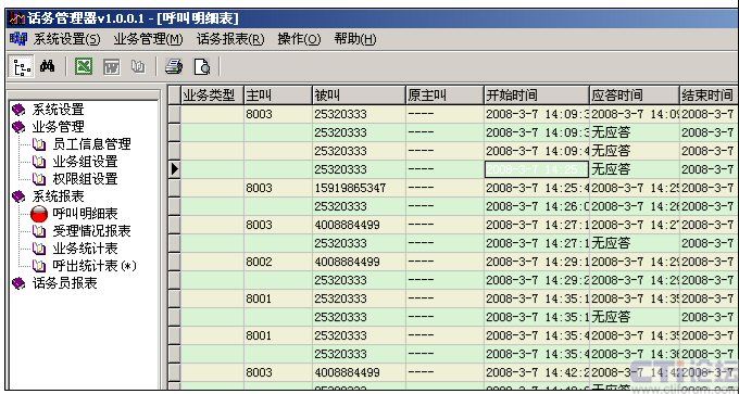 系統(tǒng)提供通話數(shù)據(jù)信息及統(tǒng)計(jì),包括: 主被叫號(hào)碼 通話時(shí)長(zhǎng) 呼出時(shí)長(zhǎng) 等待時(shí)長(zhǎng) 呼入呼出次數(shù) 話務(wù)員工作日?qǐng)?bào) |