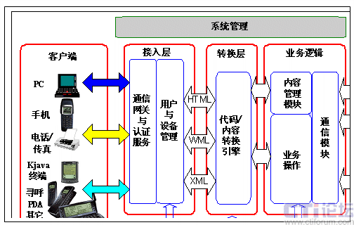 系統(tǒng)支持多種接入設(shè)備,包括廣泛使用的Web瀏覽器、支持WAP或HDML的移動(dòng)電話、支持Kjava的移動(dòng)終端、基于PalmOS或WinCE的PDA(個(gè)人數(shù)字助理)、傳統(tǒng)的移動(dòng)電話和尋呼等,并可以方便對(duì)于未來(lái)的接入設(shè)備進(jìn)行定制。