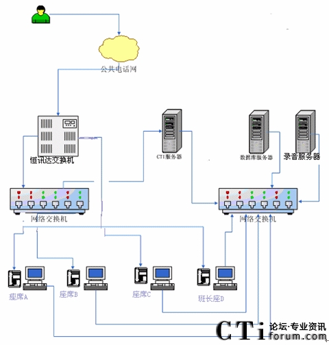 根據以上業(yè)務設計框架,我們確定了客服中心搭建時所需要的設備,系統(tǒng)的網絡拓撲結構圖如下: