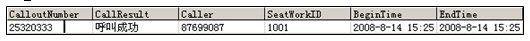 | 工號 | 登陸時間 | 退出時間 | 呼入次數 | 接通次數 | 平均振鈴時長 | 平均通話時長 | 登陸總時長 | 振鈴總時長 | 準備總時長 | 通話總時長 | 其它工作時長 | 事后整理時長 | 分機號碼 |