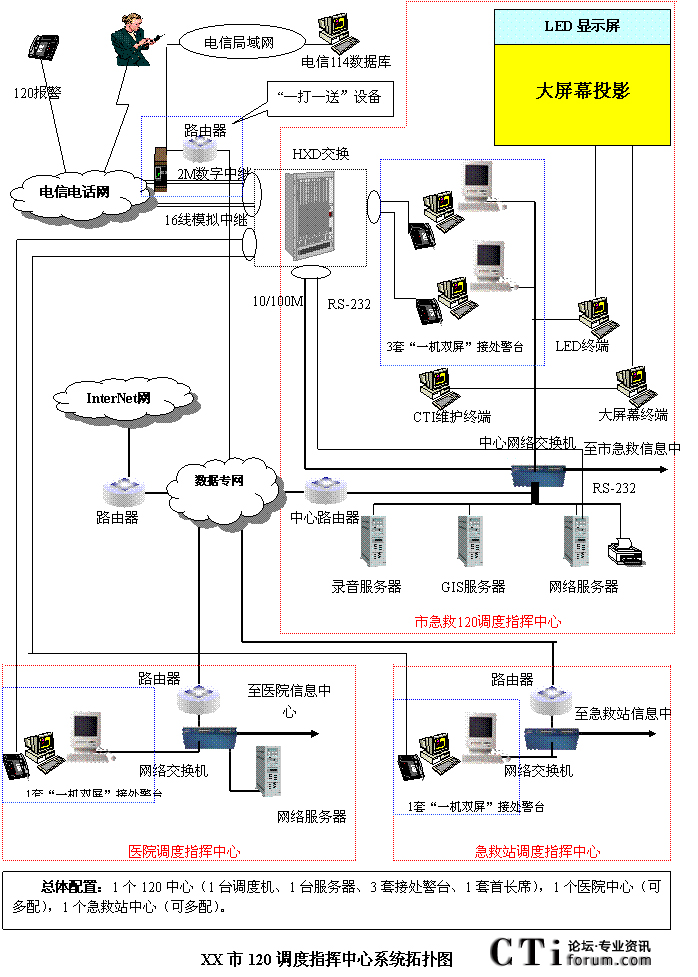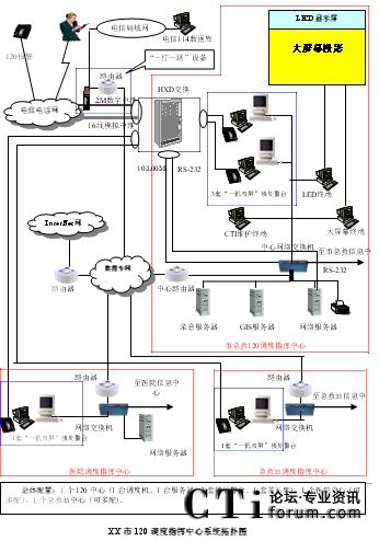 - 樹(shù)立大網(wǎng)絡(luò)概念:采用先進(jìn)的通訊、計(jì)算機(jī)網(wǎng)絡(luò)技術(shù)(如CTI技術(shù)),利用現(xiàn)有的通信資源,實(shí)現(xiàn)市人民醫(yī)院120指揮中心與急救分站的計(jì)算機(jī)網(wǎng)絡(luò)及相關(guān)領(lǐng)導(dǎo)辦公室計(jì)算機(jī)大聯(lián)網(wǎng);形成全市范圍內(nèi)120有線(xiàn)、無(wú)線(xiàn)全方位立體調(diào)度語(yǔ)音通道大網(wǎng);為今后督查聯(lián)網(wǎng)、大聯(lián)動(dòng)打下基礎(chǔ)。