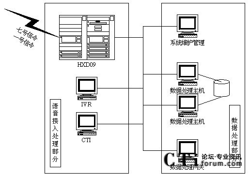 語音接入處理部分主要完成用戶的語音話路接入功能。其中:HXD09語音交換機可以支持七號信令和一號信令的數(shù)字E1線路的接入。HXD09的IVR完成自動業(yè)務受理功能,實現(xiàn)系統(tǒng)7*24小時不間斷服務。CTI完成對排隊機的監(jiān)視、控制任務,并能夠?qū)崟r的提供每個語音通道的信息配合IVR完成自動繳費業(yè)務的實現(xiàn)。