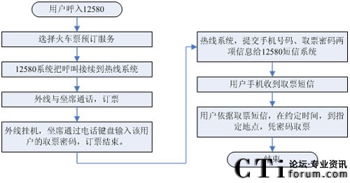 1、用戶通過手機電話訂票,首先進入12580系統(tǒng),在12580系統(tǒng)中選擇訂票服務(wù),12580系統(tǒng)通過與訂票熱線的語音線路,把用戶接續(xù)到訂票熱線系統(tǒng)。