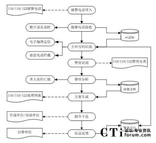 該系統(tǒng)主要分為電信子系統(tǒng)(完成聯(lián)動中心與各電信公司之間話音的傳輸、交換和分配,以及主叫號碼和主叫地址的自動查詢和傳輸?shù)龋⒔泳行淖酉到y(tǒng)(統(tǒng)一接聽和處理市民的報警、求助電話)、指揮調度子系統(tǒng)(或稱為處警中心,通過直觀的地理信息系統(tǒng)和數(shù)據(jù)庫,可以對所有的資源和警力分布了如指掌。通過一體化的無線數(shù)據(jù)傳輸和無線調度臺進行方便的統(tǒng)一管理,指揮和調度)、信息網(wǎng)絡子系統(tǒng)(聯(lián)動中心的骨干網(wǎng)絡,把各種數(shù)據(jù)數(shù)庫、接處警席位、移動的警用車載計算機等互聯(lián)在一起,形成一個強大的信息網(wǎng)絡)、無線指揮調度通信子系統(tǒng)、大屏幕顯示子系統(tǒng)、地理信息子系統(tǒng)、GPS/GIS子系統(tǒng)。
