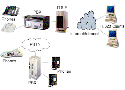 計(jì)算機(jī)IP電話產(chǎn)品,類似網(wǎng)絡(luò)會(huì)議系統(tǒng),允許用戶使用他們當(dāng)前的IP聯(lián)接把通話接到電腦上去(如通過(guò)以太網(wǎng)聯(lián)接到他們的局域網(wǎng)中)。這種作法的局限是PC用戶只可以與另一PC用戶通話。然而,使用ITS-E,這種局限將不存在。任何在網(wǎng)絡(luò)上的PC可使用H.323(用于IP電話上的ITU-T標(biāo)準(zhǔn))軟件包來(lái)實(shí)現(xiàn)通話,如微軟的網(wǎng)絡(luò)會(huì)議系統(tǒng),通過(guò)ITS-E服務(wù)器通至一個(gè)常規(guī)的電話使用者。電話用戶不需要任何新的裝備,甚至不會(huì)意識(shí)到聲音是從PC機(jī)中傳出及在IP網(wǎng)絡(luò)中傳輸。示意圖如下: