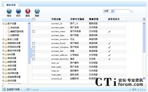 在已有模塊中可以新增字段,也可以自定義模塊后再新增字段。自定義模塊及字段可以進(jìn)行修改、刪除等功能。 |