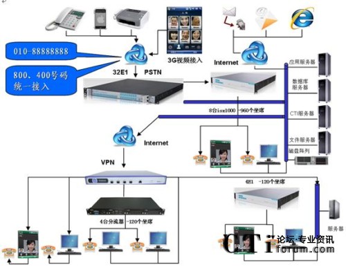 系統(tǒng)接入運(yùn)營商的數(shù)字中繼、Internet寬帶網(wǎng)絡(luò),單機(jī)最大可提供本地960個模擬坐席。通過VPN(單獨(dú)組建VPN或者利用防火墻VPN也可)可將IP坐席分布到能夠聯(lián)通網(wǎng)絡(luò)的局域網(wǎng)任意一端口電腦或者部署到傳統(tǒng)Internet廣域互聯(lián)網(wǎng)的另一城市的分支機(jī)構(gòu)。