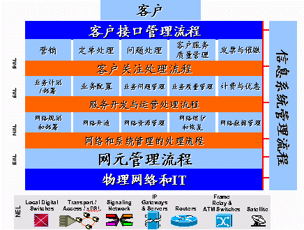 Assurance)的定義是,提供量化的測量指標,確保網(wǎng)絡服務能夠達到客戶所訂購的要求。(Service Usage)的定義是,測量電信網(wǎng)絡中各種業(yè)務的使用情況,計算處理使用電信業(yè)務的應收費用,并對電信業(yè)務的收費過程提供支持。這是從縱向的角度來看,而從橫向的角度來看,從電信管理的角度來看,OSS主要處在三個管理層面:客戶服務層;業(yè)務管理層;網(wǎng)絡管理層。