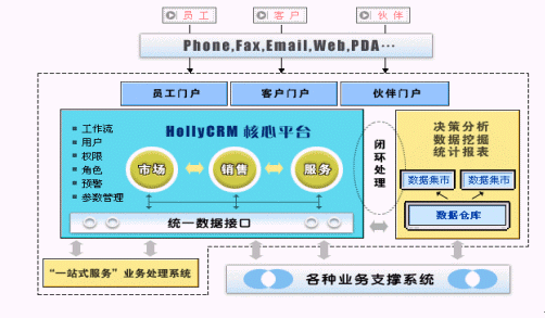 HollyCRM通過EAI與企業(yè)原有的業(yè)務(wù)系統(tǒng)充分整合,有效解決了阻礙企業(yè)內(nèi)部信息良性流轉(zhuǎn)的"信息孤島"現(xiàn)象。HollyCRM將分析型CRM產(chǎn)生的客戶價(jià)值和經(jīng)營分析結(jié)果實(shí)時(shí)反饋到運(yùn)營型CRM中,通過協(xié)作型CRM提供的接觸渠道,針對(duì)不同客戶提供個(gè)性化的營銷、銷售和服務(wù)活動(dòng)。HollyCRM實(shí)現(xiàn)了整個(gè)企業(yè)信息的閉環(huán)、良性循環(huán)。
