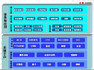 從呼叫中心的建設角度分析,系統(tǒng)將分為系統(tǒng)平臺和業(yè)務應用2大部分: