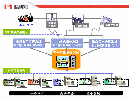 HOLLYCRM(合力金橋軟件)基于電信行業(yè)IT發(fā)展和山東省通信公司重點客戶管理系統(tǒng)建設(shè)目標和原則的要求,根據(jù)多年來對電信CRM領(lǐng)域的研究以及在實際項目建設(shè)實施過程中的經(jīng)驗獲得,科學(xué)地提出了針本項目的"一個中心,二套整合,三個系統(tǒng)"的建設(shè)理念。如下圖: