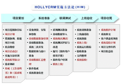 HOLLYCRM(合力金橋軟件)公司是國內(nèi)最早從事呼叫中心應(yīng)用軟件開發(fā)與服務(wù)公司,在多年的實踐經(jīng)驗基礎(chǔ)上形成了完整的“456”呼叫中心“項目實施方法論”(HIM:HOLLYCRM Implementary Methodology),即“四大實施策略、五個項目階段、六大管理專題”。該體系的有效運行對公司項目的成功上線和推進(jìn)軟件產(chǎn)品的成熟將起到至關(guān)重要的作用。
