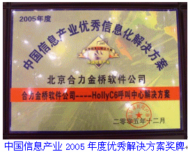 2006年1月10日,北京。中國(guó)計(jì)算機(jī)用戶協(xié)會(huì)"2005年度企業(yè)及產(chǎn)品頒獎(jiǎng)典禮"在世紀(jì)金源大飯店隆重召開(kāi)。在Call Center(呼叫中心)及CRM(客戶關(guān)系管理)領(lǐng)域位居業(yè)界領(lǐng)先地位的HOLLYCRM(合力金橋軟件)公司自主知識(shí)產(chǎn)權(quán)的HollyC6呼叫中心解決方案再度成為業(yè)界關(guān)注焦點(diǎn),榮獲"中國(guó)信息產(chǎn)業(yè)2005年度優(yōu)秀解決方案"大獎(jiǎng)。