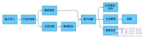 在上面的流程中,將一次客戶接觸,轉(zhuǎn)變?yōu)橐淮稳娴目蛻艋?dòng)機(jī)會(huì),通過對(duì)客戶信息360度的洞察和客戶的互動(dòng)溝通,在為客戶提供基本服務(wù)的同時(shí),根據(jù)客戶的基本資料、歷史消費(fèi)數(shù)據(jù)等,挖掘客戶的隱性需求,從而有選擇的開展客戶關(guān)懷、客戶信息收集、客戶維系、主動(dòng)營(yíng)銷活動(dòng)。下面以一個(gè)電信運(yùn)營(yíng)商的客戶呼入流程為例,說(shuō)明在一個(gè)以客戶為中心的客戶接觸流程中,坐席代表可以開展的客戶接觸活動(dòng)(圖4)。