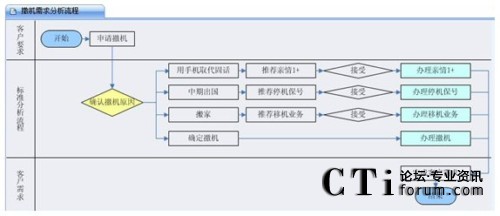 客戶呼入之后,座席人員要做的第一件事情就在IT系統(tǒng)的支持下先去捕獲客戶訴求,不用擔(dān)心座席會混淆相似的業(yè)務(wù)類型,因?yàn)楹艚兄行尼槍Φ湫偷臉I(yè)務(wù)訴求會做出非常詳盡的引導(dǎo)流程,相似的或者關(guān)聯(lián)的業(yè)務(wù)類型在此流程中會體現(xiàn)出來,座席人員可以點(diǎn)擊,快捷地出入于各業(yè)務(wù)類型的引導(dǎo)圖,通過比較、判斷,最終定位出客戶真正訴求。例如下文客戶呼入本來想做“撤機(jī)”業(yè)務(wù),通過業(yè)務(wù)引導(dǎo)圖,最終定位到了客戶的真正訴求,辦理了停機(jī)保號業(yè)務(wù)或者移機(jī)業(yè)務(wù)。