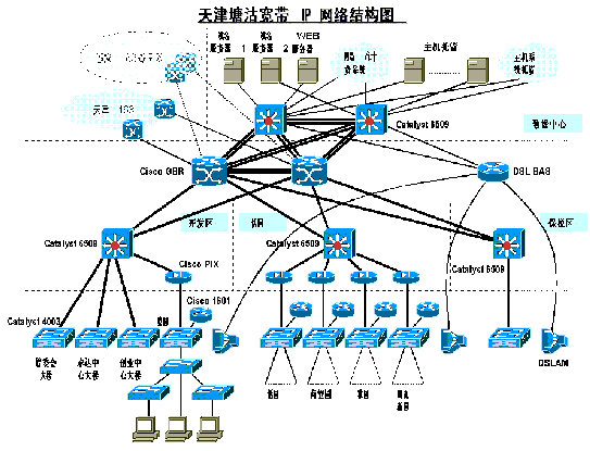 除以上三層之外,在塘沽電信局將建立一個數(shù)據(jù)中心,由兩臺Cisco Catalyst6509第三層交換機(jī)為數(shù)據(jù)中心提供數(shù)據(jù)交換及路由。接入的DSLAM設(shè)備,小區(qū)內(nèi)的樓層交換機(jī)及用戶前端設(shè)備(CPE)也屬于接入層。接入層主要為最終用戶提供多種寬帶接入方式。