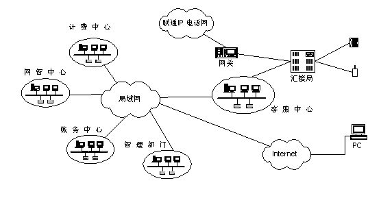 聯(lián)通北京分公司將客戶服務(wù)系統(tǒng)與現(xiàn)有計費、營業(yè)、帳務(wù)系統(tǒng)進行組織,形成了一個有機的結(jié)合體,能夠充分發(fā)揮出現(xiàn)有系統(tǒng)的優(yōu)勢?蛻舴⻊(wù)系統(tǒng)從營業(yè)帳務(wù)系統(tǒng)提取相關(guān)用戶資料,建立客戶服務(wù)的系統(tǒng)資料庫,從計費系統(tǒng)提取相關(guān)用戶話費資料等供查詢使用。同時客服系統(tǒng)還將與北京聯(lián)通現(xiàn)有的計費、營業(yè)、帳務(wù)、網(wǎng)管等相關(guān)系統(tǒng)以及Internet相連,提供業(yè)務(wù)處理和用戶自助服務(wù)等業(yè)務(wù)。本客服中心通過2對路由器和DDN專線與聯(lián)通北京分公司現(xiàn)有的局域網(wǎng)(包括管理部門、網(wǎng)管中心、計費中心、帳務(wù)中心等相關(guān)系統(tǒng))連接,并通過該局域網(wǎng)訪問Internet。