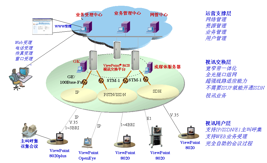 面對公眾視訊業(yè)務(wù)發(fā)展的契機(jī),由于基于窄帶H.320的視訊系統(tǒng)較為成熟,而基于IP網(wǎng)的H.323系統(tǒng)被普遍看好,ISDN目前是最方便的公眾視訊系統(tǒng)接入手段,相對于其他接入方式(如E1、DDN、FR、ATM、IP等)使用方便,可方便通過撥號方式與任何聯(lián)網(wǎng)地區(qū)建立會議。ViewPoint 8620視訊交換平臺采用寬窄帶一體化設(shè)計(jì),可為各行各業(yè)用戶提供完備的一體化解決方案,不僅能提供大容量ISDN用戶撥號接入,還能提供大容量的E1/V.35/IP方式接入。公眾視訊業(yè)務(wù)的發(fā)展,將視訊業(yè)務(wù)從單純?yōu)樯贁?shù)特定用戶群提供遠(yuǎn)程會議服務(wù),轉(zhuǎn)而面向公眾,為各行各業(yè)提供視訊業(yè)務(wù)。